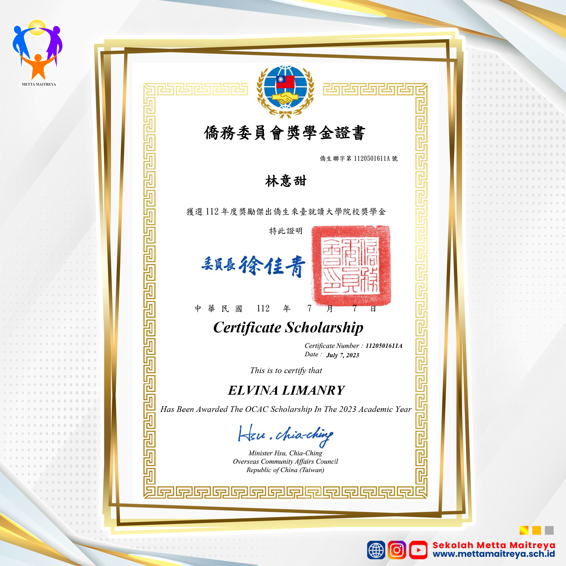 Penyerahan Piagam Beasiswa Siswa Berprestasi OCAC dari Pemerintah Taiwan Tahun Akademik 2023 | SMK METTA MAITREYA